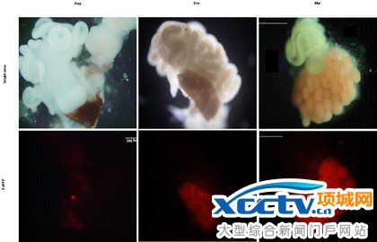 上方珊瑚卵以萤光照射后,即出现下方的红色珊瑚卵。