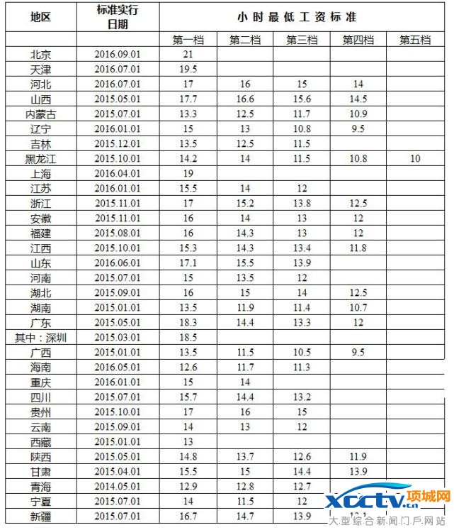 第一档小时最低工资标准,北京最高,为21元。天津(19.5元)与上海(19元)分列第二、三位。海南最低,为12.6元,其次是青海,12.9元,西藏,13元。
