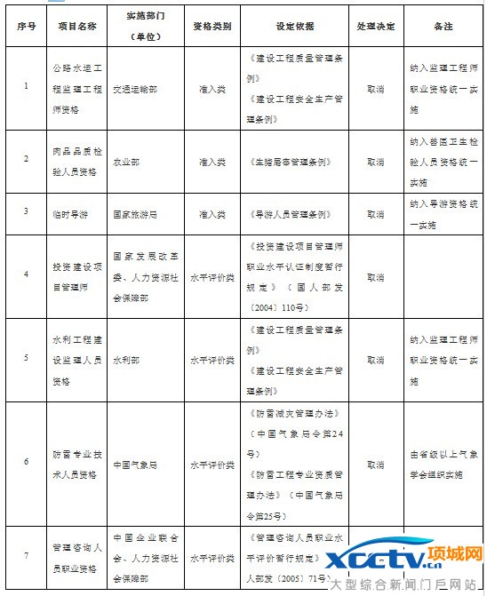 一、取消的专业技术人员职业资格许可和认定事项(共计7项,其中准入类3项,水平评价类4项)