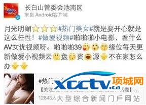 “热门美女”“啪啪啪小电影”“女优视频”……近日,有热心网友发现认证为吉林省长白山保护开发区管理委员会池南经济管理区委员会的官方微博,发送多条露骨色情信息叫卖资源。今日(10月14日)下午,负责官微管理的池南区党群工作部工作人员介绍,色情微博是官微被盗后所发,并非工作人员所为。