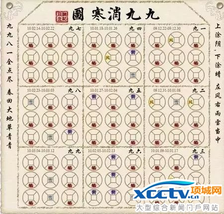 冬至民间有贴绘"九九消寒图"的习俗。消寒图是记载进九以后天气阴晴的。以卜来年丰欠。消寒图的形式很多。简单的是画纵横九栏格子,每格中间再画钱形,共得八十一钱,每天涂一钱,涂法是"上阴下晴、左风右雨、雪当中",民间歌谣谓:"上阴下晴雪当中,左风右雨要分清,九九八十一全点尽,春回大地草青青。"或者选择九个九画的字联成一句,放在格中,也是日涂一笔。一般选用的九画字联句有"庭(亭)前垂柳珍重待春风”。