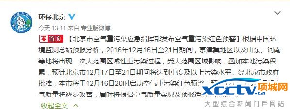 12月15日下午,北京市环保局通过官方微博发布消息称,北京市空气重污染应急指挥部首次发布空气重污染红色预警,机动车周末也将单双号行驶。
