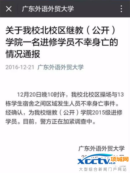 21日凌晨0点42分,广东外语外贸大学官方微信号发出情况通报表示:12月20日晚10时许,我校北校区操场与13栋学生宿舍之间区域发生人员不幸身亡事件。