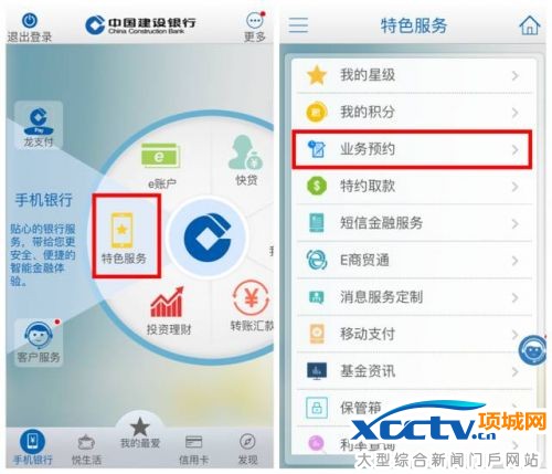 1、打开手机银行APP——选择特色服务——业务预约;