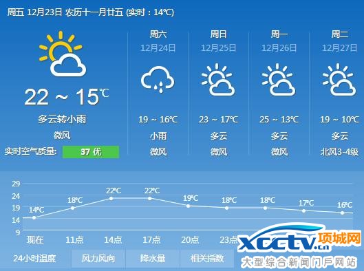 【广州市今日天气】据广州市气象台预测:今日白天:多云;夜间:多云间阴天;气温介于15到22℃之间;相对湿度介于45%~85%之间;吹轻微的偏东风。(广州市气象台2016年12月23日07时30分发布)