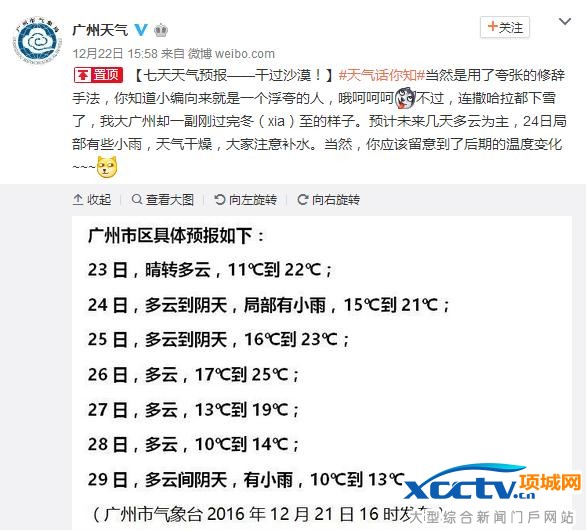 【七天天气预报——干过沙漠!】#天气话你知#当然是用了夸张的修辞手法,你知道小编向来就是一个浮夸的人,哦呵呵呵。不过,连撒哈拉都下雪了,我大广州却一副刚过完冬(xia)至的样子。预计未来几天多云为主,24日局部有些小雨,天气干燥,大家注意补水。当然,你应该留意到了后期的温度变化~~~