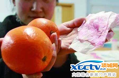 染过色的橙子,表面看起来特别红艳,仔细观察,可发现表皮皮孔有红色斑点,一些橙表面甚至有红色残留物。