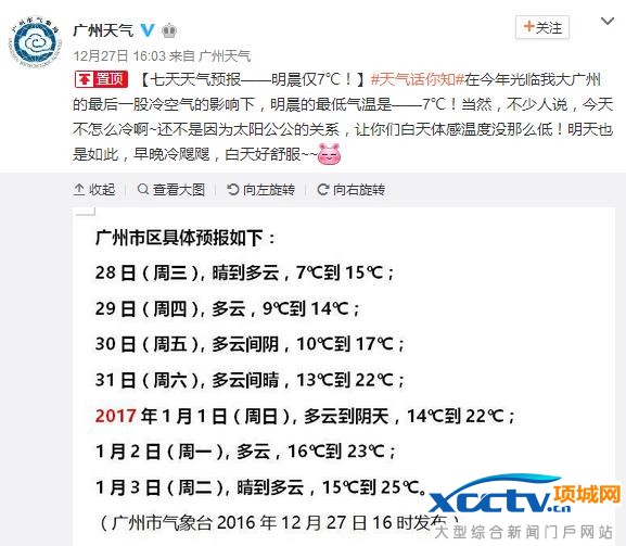 【七天天气预报——明晨仅7℃!】#天气话你知#在今年光临我大广州的最后一股冷空气的影响下,明晨的最低气温是——7℃!当然,不少人说,今天不怎么冷啊~还不是因为太阳公公的关系,让你们白天体感温度没那么低!明天也是如此,早晚冷飕飕,白天好舒服~~
