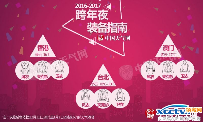 香港、台北在跨年夜还将有烟花汇演,着实是跨年的好去处。跨年夜当晚,香港、澳门、台北的气温将在16℃以上,多云天气为主。