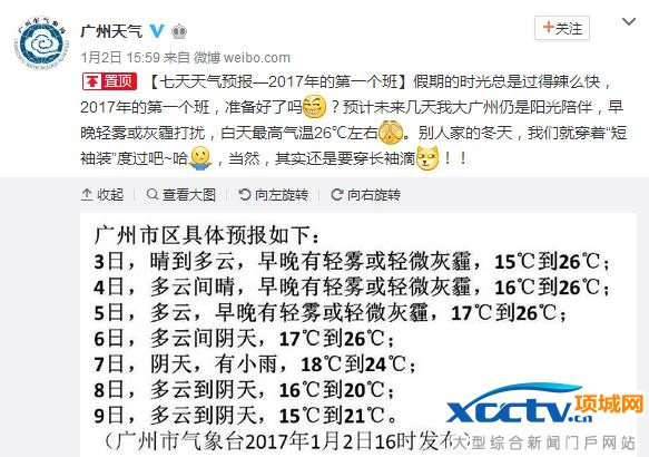 【七天天气预报—2017年的第一个班】假期的时光总是过得辣么快,2017年的第一个班,准备好了吗?预计未来几天我大广州仍是阳光陪伴,早晚轻雾或灰霾打扰,白天最高气温26℃左右。别人家的冬天,我们就穿着“短袖装”度过吧~哈,当然,其实还是要穿长袖滴!!