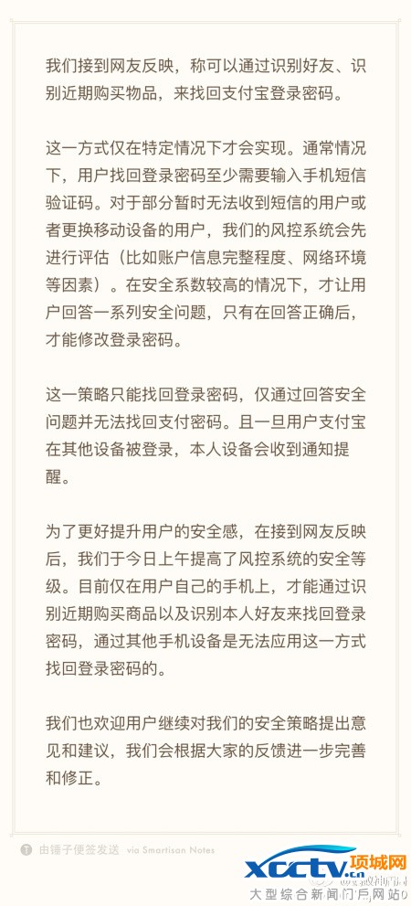 支付宝还表示,这一策略只能找回登录密码,仅通过回答安全问题并无法找回支付密码。目前仅在用户自己的手机上,才能通过识别近期购买商品以及识别本人好友来找回登录密码,通过其他手机设备是无法应用这一方式找回登录密码的。