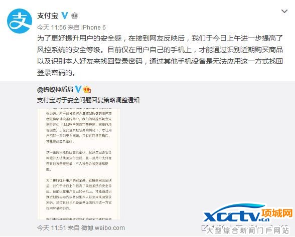 支付宝强调,为了更好提升用户的安全感,在接到网友反映后,支付宝今日上午进一步提高了风控系统的安全等级。目前仅在用户自己的手机上,才能通过识别近期购买商品以及识别本人好友来找回登录密码,通过其他手机设备是无法应用这一方式找回登录密码的。