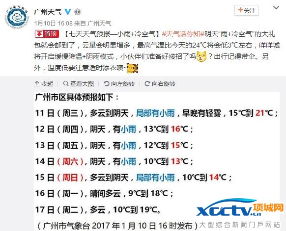 2017年1月11日广州天气预报:阴天到多云 有小雨