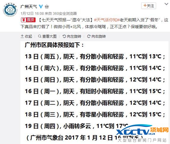 2017年1月13日广州天气预报:阴天有分散小雨 最高气温13℃(2)