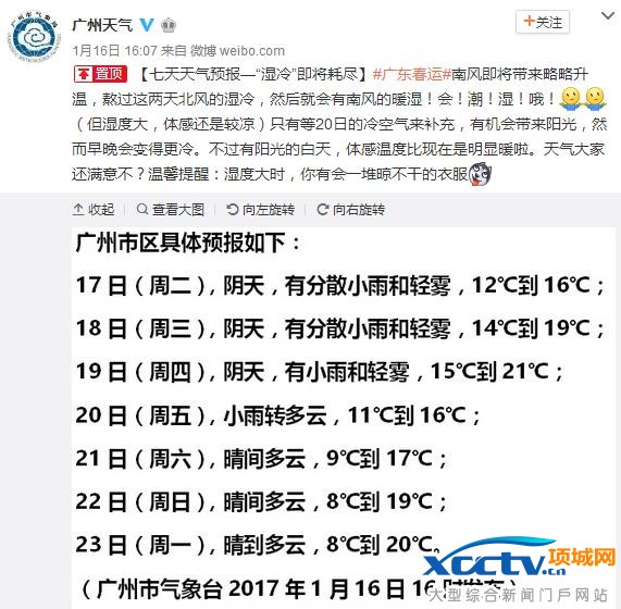 【七天天气预报—“湿冷”即将耗尽】#广东春运#南风即将带来略略升温,熬过这两天北风的湿冷,然后就会有南风的暖湿!会!潮!湿!哦!(但湿度大,体感还是较凉)只有等20日的冷空气来补充,有机会带来阳光,然而早晚会变得更冷。不过有阳光的白天,体感温度比现在是明显暖啦。天气大家还满意不?温馨提醒:湿度大时,你有会一堆晾不干的衣服。