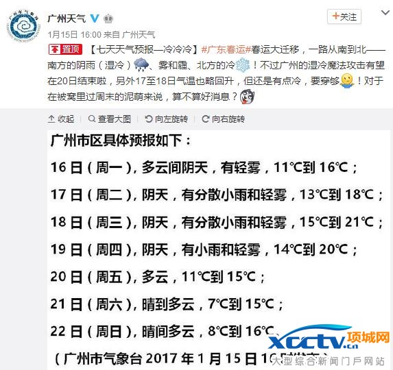这几天广州冷出了接近冬季气温的水平,冷空气还嫌不给力,今天还要到广东来雪上加霜。不过大家也不用太忧虑,从目前的预报看,未来三天气温逐渐上升,到后天还有机会超过20℃。