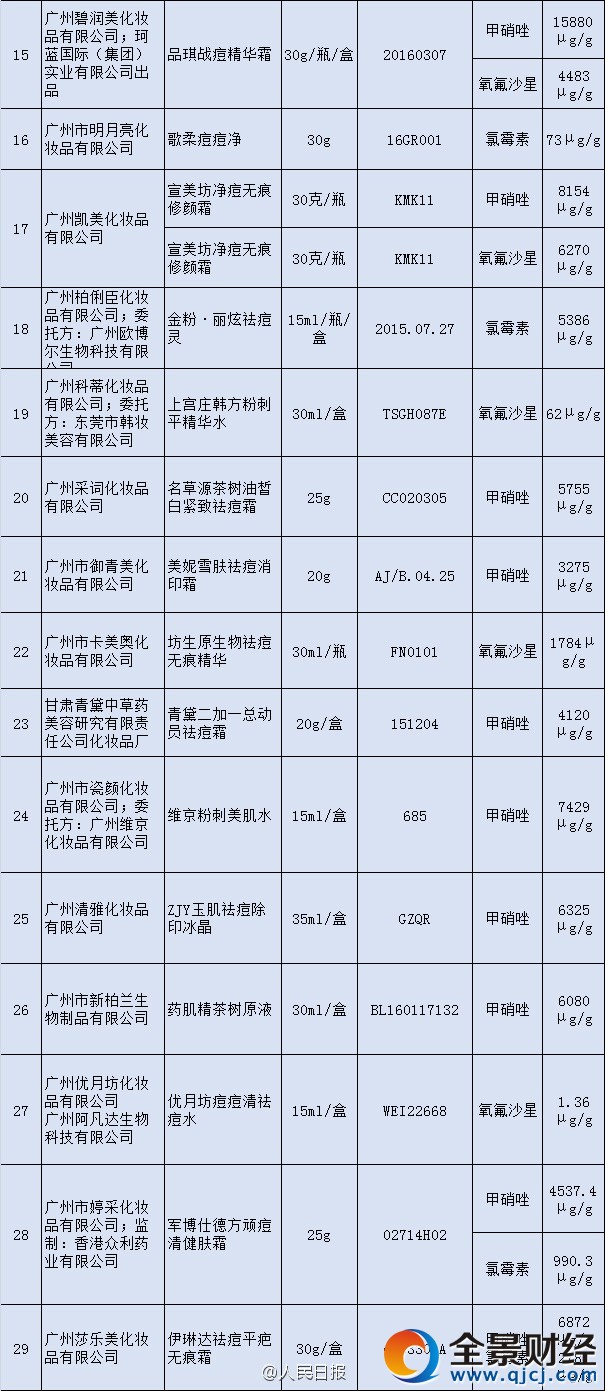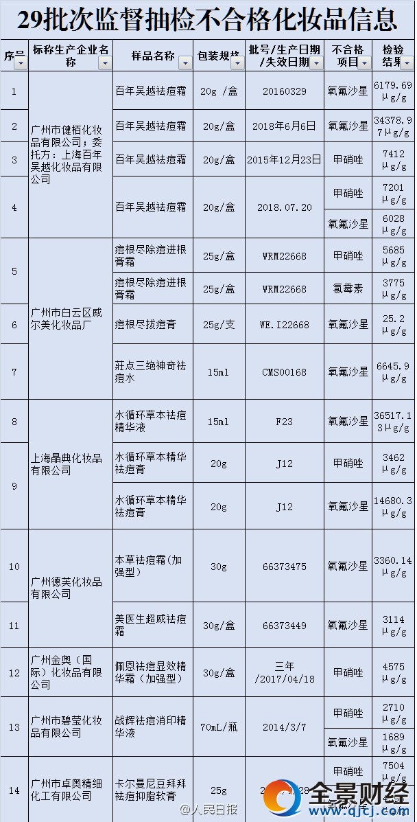 一、涉及的标称生产企业和不合格产品为:广州市健栢化妆品有限公司(委托方:上海百年吴越化妆品有限公司)生产的百年吴越祛痘霜等4批次产品;广州市白云区威尔美化妆品厂生产的痘根尽除痘膏霜等3批次产品;上海晶典化妆品有限公司生产的水循环草本精华祛痘膏等2批次产品;广州德芙化妆品有限公司生产的本草祛痘霜(加强型)等2批次产品;广州金奥(国际)化妆品有限公司生产的佩恩祛痘显效精华霜(加强型)、广州市碧莹化妆品有限公司生产的战辉祛痘消印精华液、广州市卓奥精细化工有限公司生产的卡尔曼尼袪痘抑脂软膏、广州碧润美化妆品有限公司(珂蓝国际(集团)实业有限公司出品)生产的品琪战痘精华霜、广州市明月亮化妆品有限公司生产的歌柔痘痘净、广州凯美化妆品有限公司生产的宣美坊净痘无痕修颜霜、广州柏俐臣化妆品有限公司(委托方:广州欧博尔生物科技有限公司)生产的金粉丽炫祛痘灵、广州科蒂化妆品有限公司(委托方:东莞市韩妆美容有限公司)生产的上宫庄韩方粉刺平精华水、广州采词化妆品有限公司生产的名草源茶树油皙白紧致祛痘霜、广州市御青美化妆品有限公司生产的美妮雪肤祛痘消印霜、广州市卡美奥化妆品有限公司生产的坊生原生物祛痘无痕精华、甘肃青黛中草药美容研究有限责任公司化妆品厂生产的青黛二加一祛痘霜、广州市瓷颜化妆品有限公司(委托方:广州维京化妆品有限公司)生产的维京粉刺美肌水、广州清雅化妆品有限公司生产的ZJY玉肌祛痘除印冰晶、广州市新柏兰生物制品有限公司生产的药肌精茶树原液、广州优月坊化妆品有限公司(广州阿凡达生物科技有限公司)生产的优月坊痘痘清祛痘水、广州市婷采化妆品有限公司(监制:香港众利药业有限公司)生产的军博仕德方顽痘清健肤霜、广州莎乐美化妆品有限公司生产的伊琳达祛痘平疤无痕霜等各1批次产品。