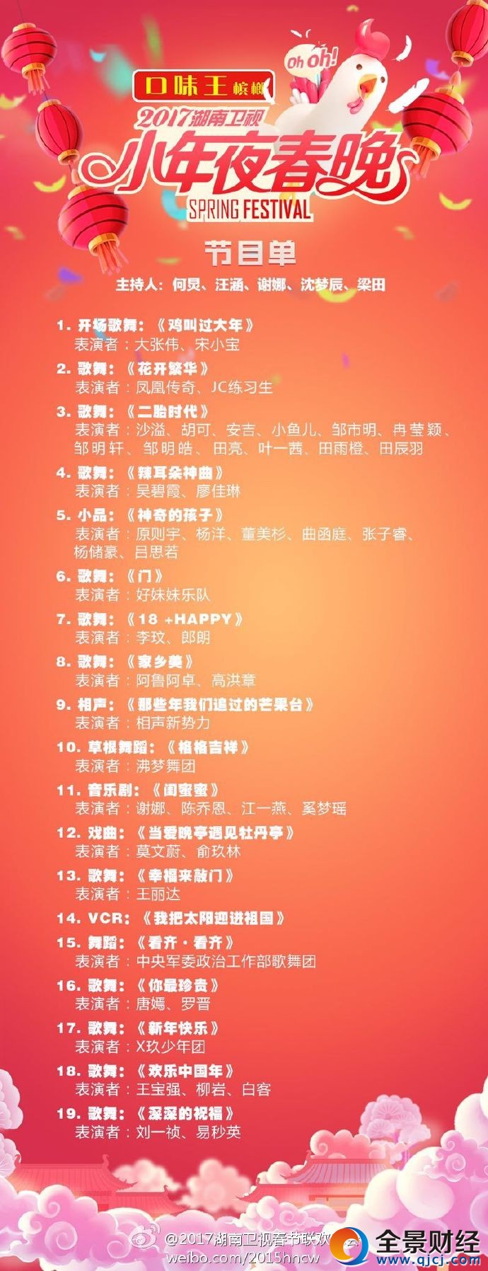 2017湖南卫视春晚明星阵容:《我们来了》女神团、《爸爸去哪儿》萌娃团等