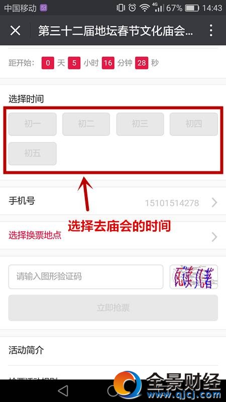 ⑥选择您要去庙会的时间,输入图形验证码,点击“立即抢票”即可