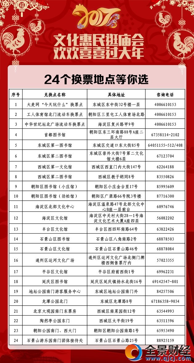 温馨提示:地坛公园、龙潭公园、大观园、陶然亭公园(厂甸庙会)、朝阳公园、石景山游乐园换票点只兑换本公园庙会门票,不提供其他公园门票。上述6个公园之外的换票点,可提供十大庙会和活动的纸质门票。