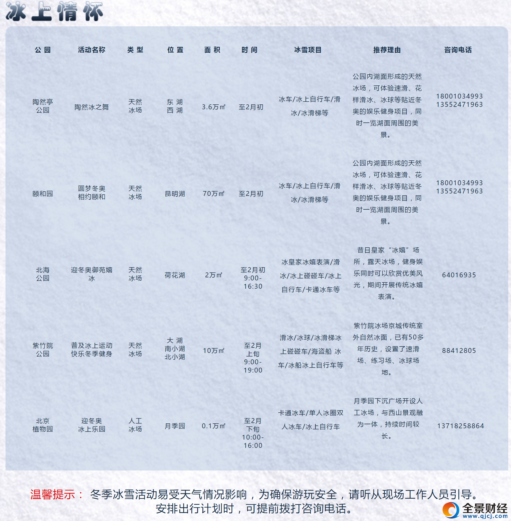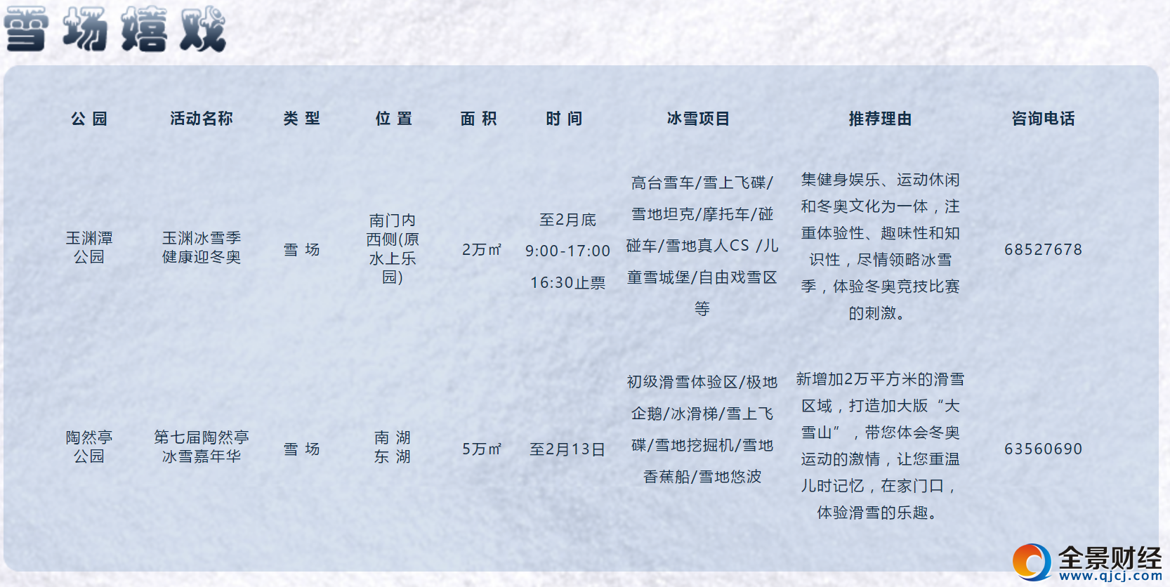 京城各大公园和风景区还准备了特别的冬季冰雪活动。自古有“冬宫”美称的北海公园配备了各类冰车、冰鞋、冰上自行车,并推出冰滑梯等冰上娱乐项目。玉渊潭公园准备了适于儿童、青少年的冰雪项目,包括高台雪圈滑道、雪地摩托车、雪地小坦克、雪地碰碰车、雪地悠波球等,让民众体验地道的冰雪盛宴。