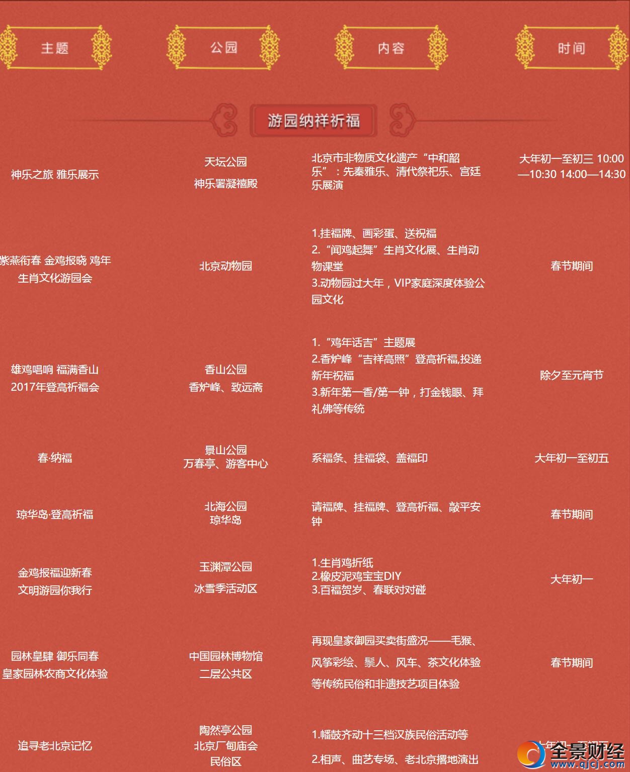中国农历鸡年春节期间,北京各大公园和风景区将推出庙会休闲娱乐、传统文化展演、游园赏景赏花、冰雪项目体验四大类57项精品文化活动,以满足民众节日娱乐的不同需求。