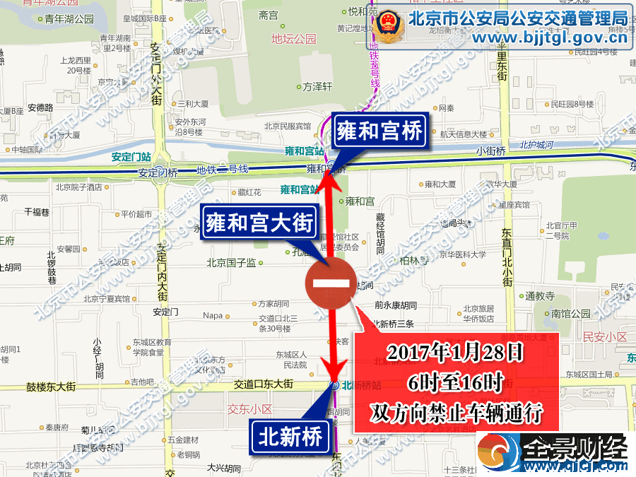 为保证春节期间雍和宫大街的道路交通安全与畅通,根据《中华人民共和国道路交通安全法》的有关规定,决定2017年1月28日(正月初一)6时至16时,雍和宫大街由雍和宫桥下路口(不含)至北新桥路口(不含)双方向禁止车辆通行。
