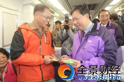 桃园市长郑文灿在车厢内发送福袋给试乘民众。