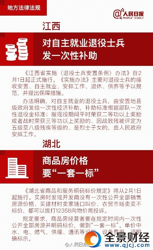 2017年2月1日起,这些新规将影响你的生活!】①电信业务用户签入网协议必须实名;②航站楼建设要考虑旅客步行距离等因素;③广东:女职工生育享受98天产假;④湖北:商品房价格要“一套一标”;⑤江西:对自主就业退役士兵发一次性补助;⑥南京:积分落户政策正式施行。