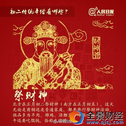 祭财神:北方在正月初二祭财神,这天无论是商贸店铺,还是普通家庭,都要举行祭财神活动。各家把除夕夜接来的财神祭祀一番。实际上是把买来的粗糙印刷品焚化了事。这天中午要吃馄饨,俗称“元宝汤”。祭祀的供品用鱼和羊肉。老北京的大商号,这天均大举祭祀活动,祭品要用“五大供”,即整猪、整羊、整鸡、整鸭、红色活鲤鱼等,祈望今年要发大财。