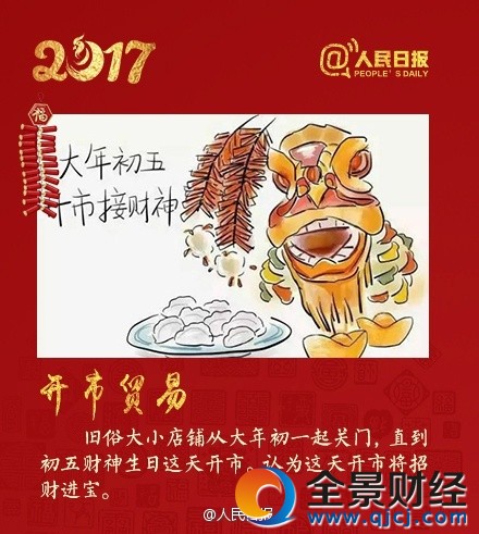 今日初五,年俗多多:①迎财神,过了初一,最重要的活动就是接财;②破五,诸多禁忌过此日皆可破;③开市,大年初一关门的大小店铺,会在今天开市,意在招财进宝…更多↓吃饺子,放鞭炮,迎财神,贺团圆!转发,迎财运,讨个好彩头!