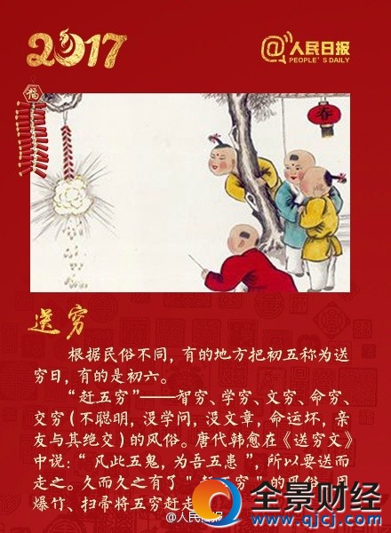 送穷:正月初五“送穷”,是我国古代民间一种很有特色的岁时风俗。这一天各家用纸造妇人,称为“扫晴娘”,“五穷妇”,“五穷娘”,身背纸袋,将屋内秽土扫到袋内,送门外燃炮炸之。这一习俗又称为“送穷土”,“送穷媳妇出门”。民间广泛流行的送穷习俗,反映了我国人民普遍希望辞旧迎新,送走旧日贫穷困苦,迎接新一年的美好生活的传统心理。