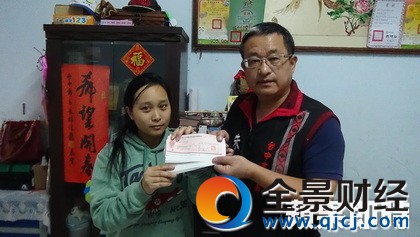 阿萱(左)经议员朱元宏见证,收下捐款。