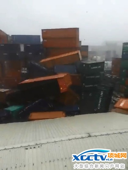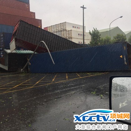 高市小港区亚太路一间私人货柜堆置场,堆放的货柜遭强风吹落。翻摄画面