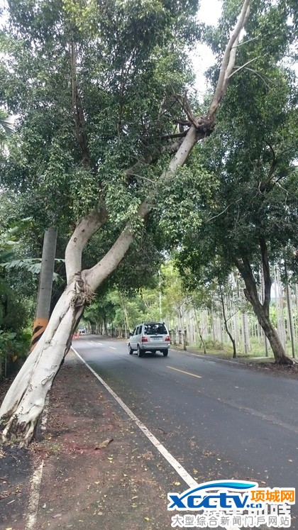 车辆从倾斜的老树下经过,险象环生。高堂尧摄