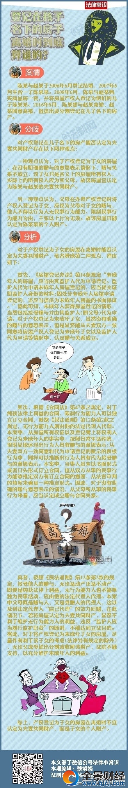 【登记在孩子名下的房子,离婚时到底算谁的?】陈某与赵某是夫妻,两人共同购买商品房一套,并将房屋产权人登记为他们的儿子陈某某。2016年8月,陈某想与赵某离婚,赵某同意离婚,但提出要分割登记在儿子名下的房产。这种产权登记为子女的房屋离婚时能否认定为夫妻共同财产?离婚时到底算谁的?详↓