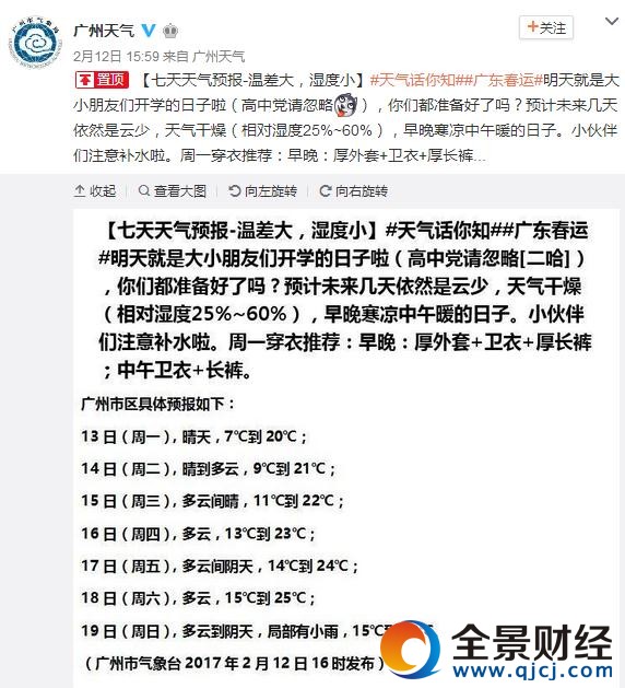更多广州实时天气信息可在“广州全景财经”微信公众号在线查询!微信直接输入“广州全景财经”或扫描下方二维码关注后,进入“网上办事”——“天气预报”进行查看即可。