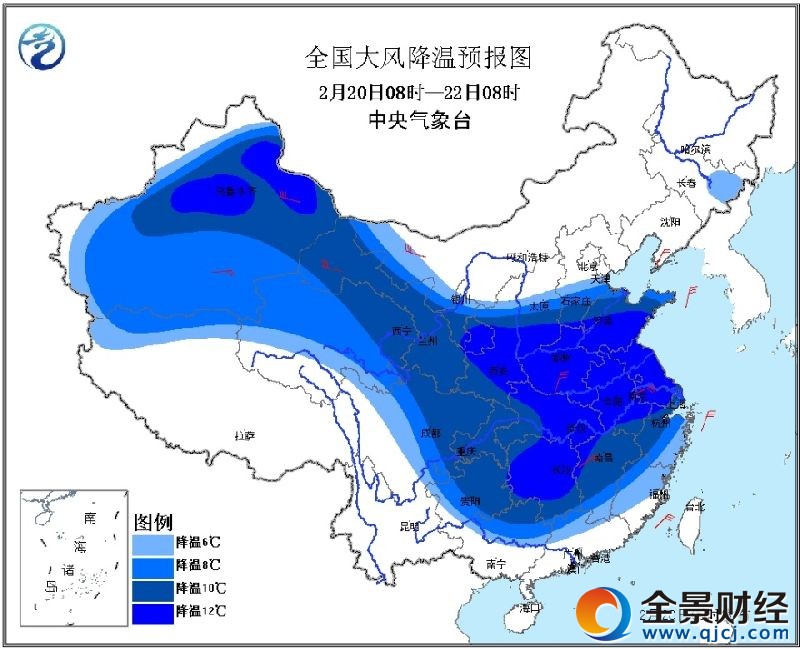受强冷空气影响,预计20日至22日,新疆、西北地区东部、西南地区东部、华北中南部、黄淮、江淮、江汉、江南、华南北部等地气温将下降8℃以上,部分地区超过12℃。西北地区东部和长江中下游以北地区将伴有4~6级大风,东部海域将有6~8级偏北风。内蒙古西部伴有沙尘天气。中央气象台2月20日06时继续发布寒潮蓝色预警。