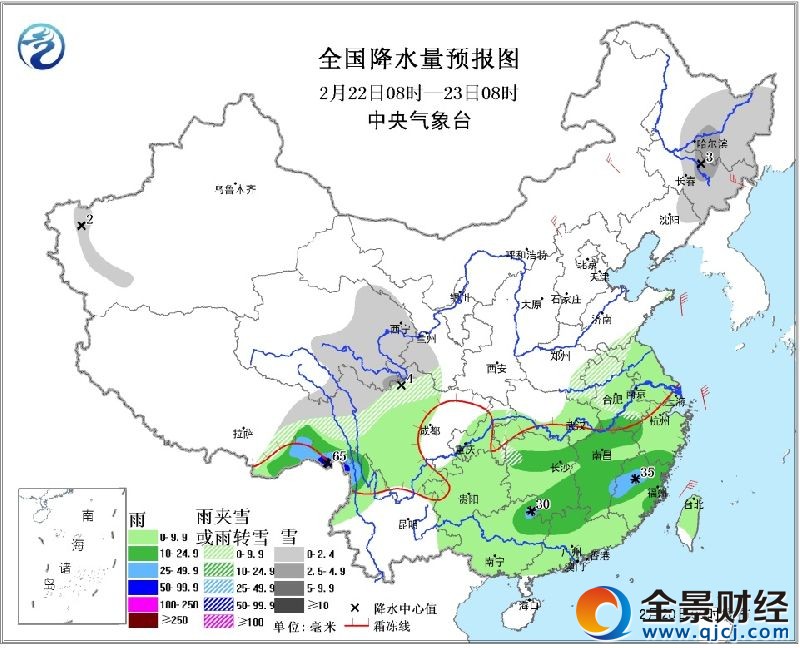 22日08时至23日08时,青海中东部、东北地区中东部及黄淮南部等地的部分地区有小雪或雨夹雪,局地中雪;西藏东部、西南地区北部和东部、江淮、江南及华南等地有小到中雨,局地大雨。内蒙古中东部、东北地区等地有4~6级风(见图3)。