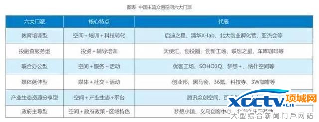 就众创空间的目前发展而言,主流众创空间根据其运营主体和核心服务能力等形成各自特色,共六大流派,分别为教育培训型、投融资服务型、新型房产型、媒体延伸型、产业生态资源分享型、政府主导型。在服务能力上各有所长,目前已形成一定的格局。