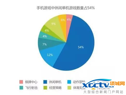 手机游戏各项分类中,休闲单机游戏的数量仍占较多,占手游数量的比例54%,其他类型包括动作冒险、体育竞速、角色扮演等数量分布比例分别为12%、9%、7%。