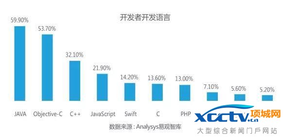 开发者选择的开发语言方面,JAVA作为安卓操作系统的最主要编程语言,成为移动开发者最青睐的开发语言,其次,Objective-C作为iOS系统中应用最多的语言,使用的开发者也达到了53.7%。除了这两大开发语言外,C++、Java、Swift也是移动开发者使用频率较高的APP开发语言。