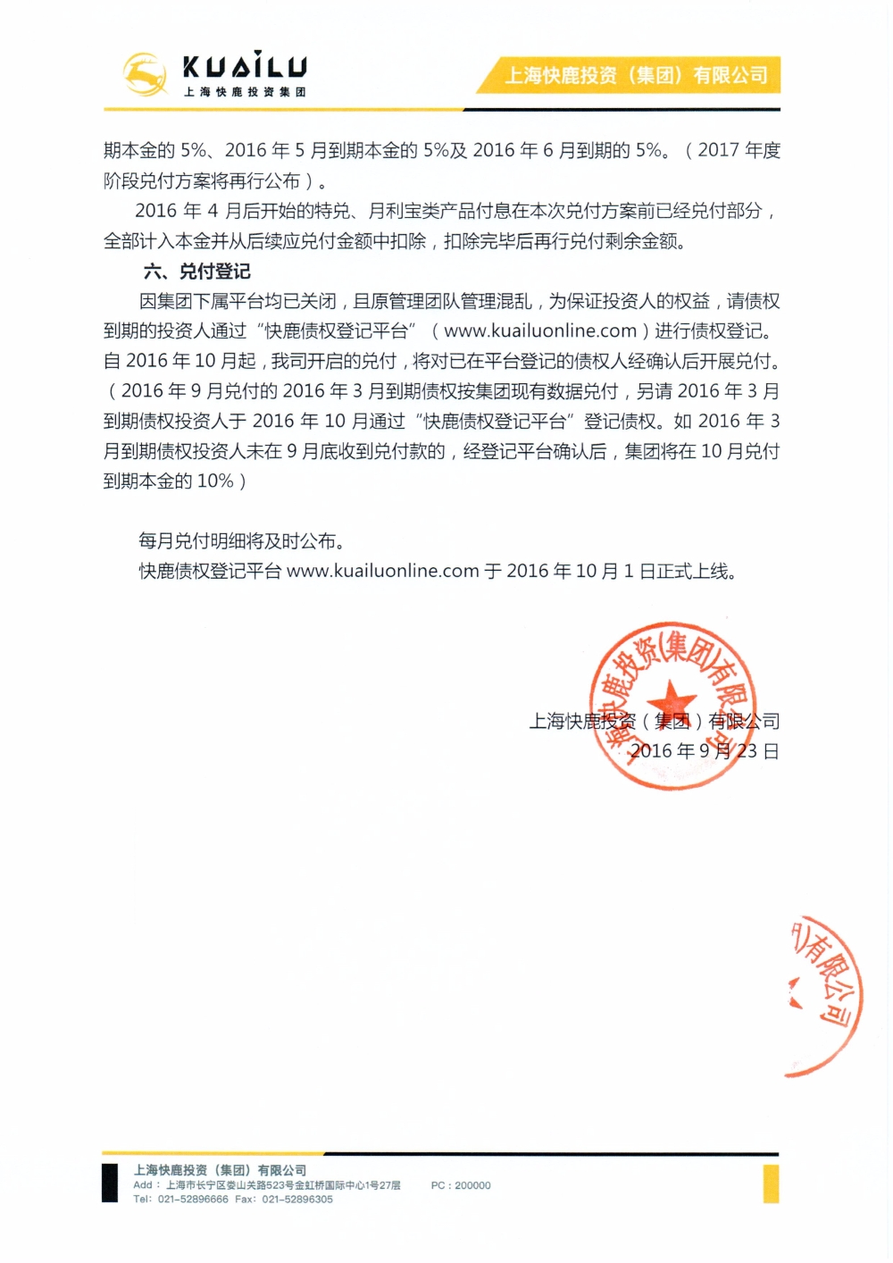 快鹿设立了“快鹿债权登记平台”,投资人需进行债权登记,2016年10月起,快鹿将对已在平台登记的债权人经确认后开展兑付。(2016年9月兑付2016年3月的则按照现有的数据兑付,但也需其进行登记,如有遗漏的3月到期的未在9月底前收到回款,快鹿将在10月为其兑付本金的10%)。