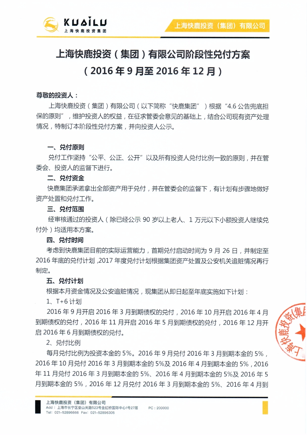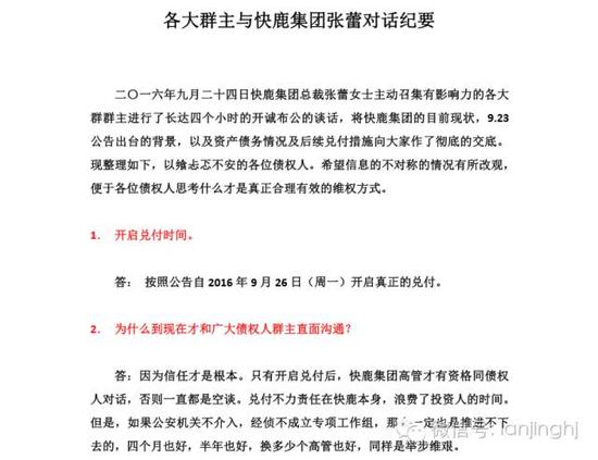 9月23日,快鹿发布阶段性兑付方案,方案称,首期兑付启动时间为9月26日,并制定至2016年底的兑付计划,兑付计划:
