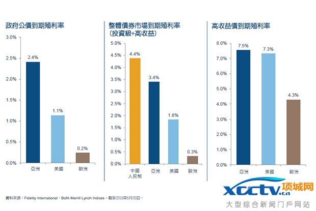 资料来源︰Fidelity International、美银美林债券指数,截至2016年8月31日。亚洲公债到期殖利率为美银美林亚洲公债指数到期殖利率(AGVT)、美国公债到期殖利率为美银美林美国公债指数到期殖利率(G0A0)、欧洲公债到期殖利率为美银美林欧洲公债指数殖利率(W0GE)、中国点心债到期殖利率为美银美林中国点心债指数到期殖利率(CNHJ)、亚洲整体债券市场到期殖利率为美银美林亚洲高收益债指数(ACCY)与美银美林亚洲投资级债指数(ADIG)平均值、美国整体债券市场到期殖利率为美银美林投资级债指数(C0A0)与美银美林美国高收益债指数(H0A0)平均值、欧洲整体债券市场到期殖利率为美银美林欧洲高收益债指数(HE00)与美银美林欧洲投资级债指数(EMUL)/指数举例仅为投资参考,惟投资人无法直接投资该指数。