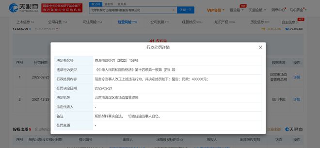 天眼查App显示,近日,北京新东方迅程网络科技股份有限公司因涉嫌利用虚假或使人误解的价格手段诱骗消费者交易,被北京市海淀区市场监督管理局罚款40万元。