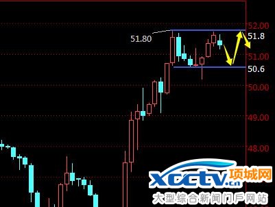 下方回落50.6附近做多,止损0.4,目标51.8;