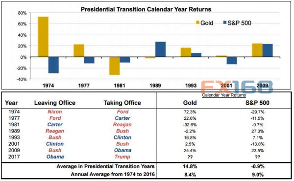 对数据进行分析的话,投资者可以发现,那7个年份的黄金平均回报达到+14.8%,与此形成对比,自1974年至2016年黄金平均回报为+8.4%。
