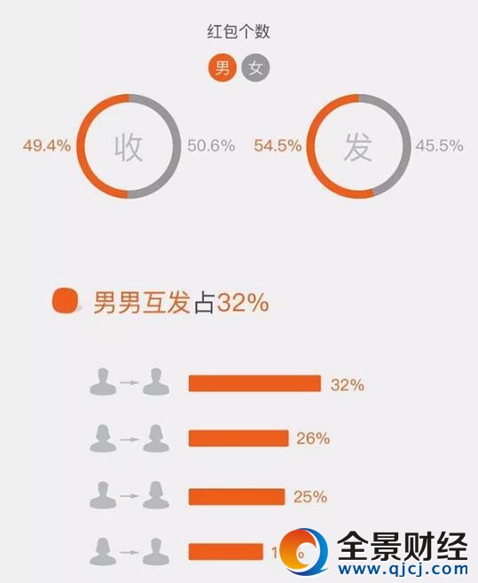1月27日,除夕夜,在所有微信红包往来关系中,男男互发的比例最高,达到32%。其次是女性发给女性,比例为26%。然后才是男性发给女性,仅为25%。最后是女性发给男性,为17%。
