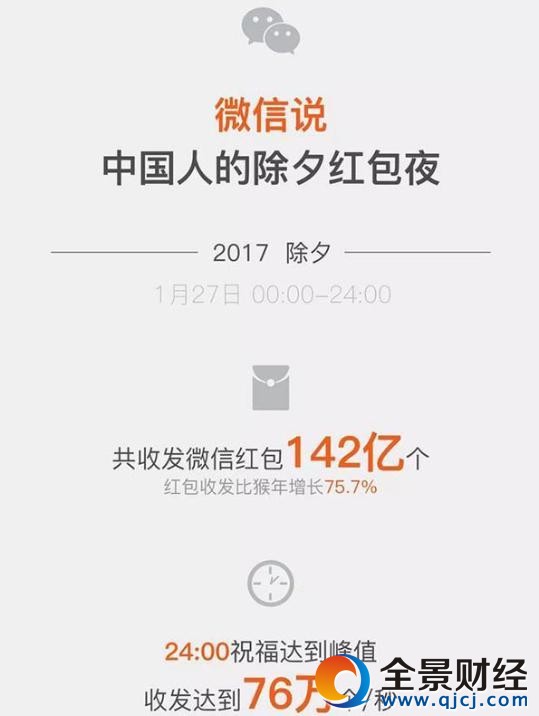 除夕全天,微信红包收发量达142亿个,比前一年增长75.7%。峰值出现在除夕最后一秒,即1月28日0点整,每秒红包收发达到76万个。